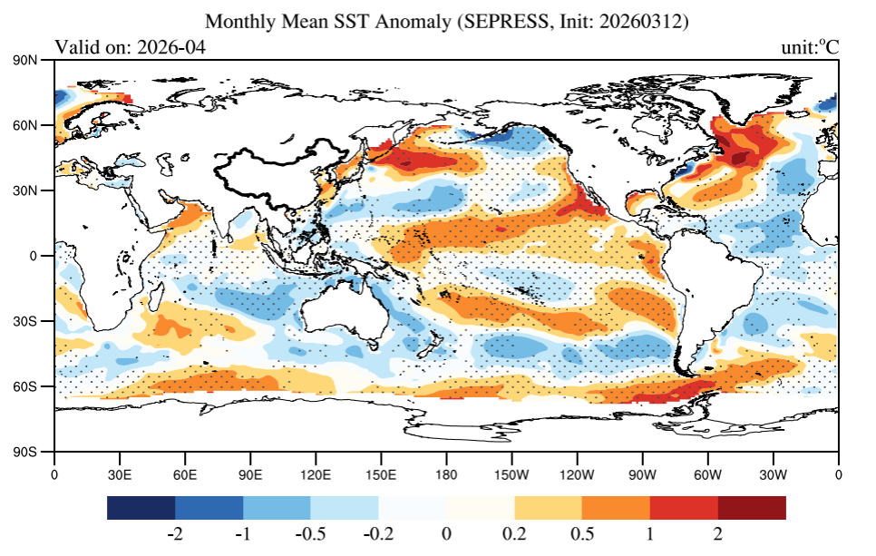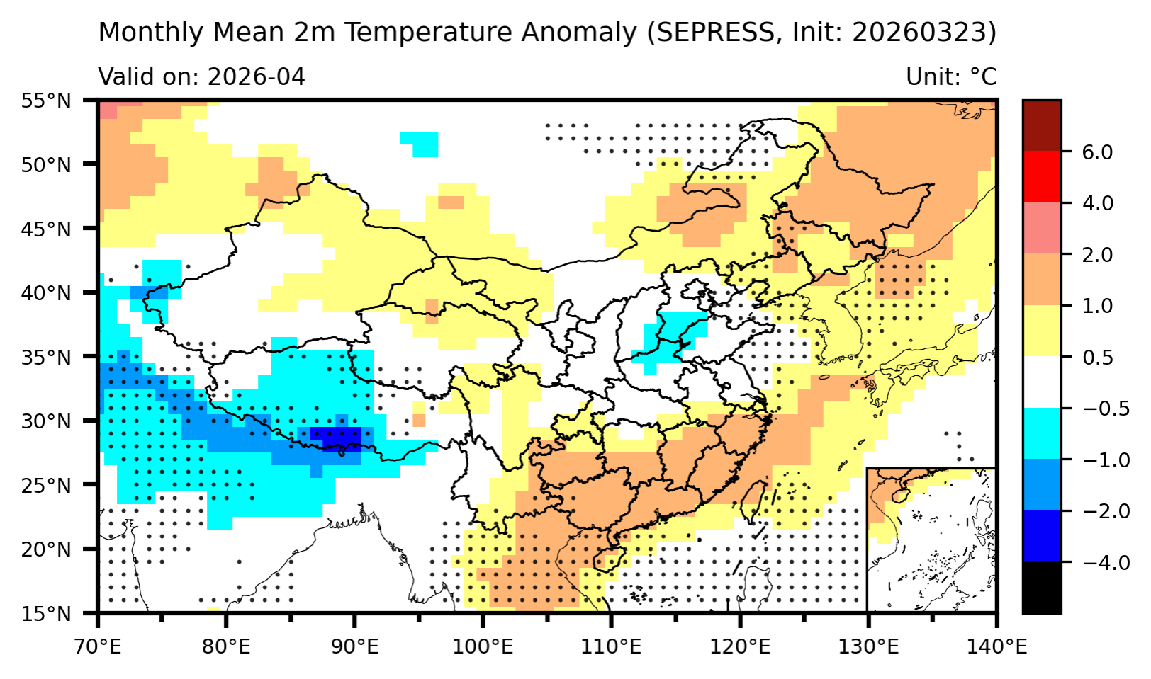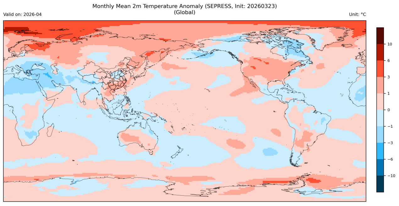 In April 2026, China's surface temperature is expected to exhibit a "Warm South, Cold North" pattern, with localized warming in the Northeast. Regions including the three Northeastern provinces and northern Inner Mongolia are projected to see temperatures more than 1°C above normal. The middle and lower reaches of the Yangtze River and regions to its south will generally experience warmer conditions, with significant increases of over 1°C in southern South China, southern Jiangnan, and eastern Yunnan. Xinjiang, Gansu, Qinghai, and Sichuan are expected to range from near-normal to slightly warm. Conversely, the North China to Huang-huai region will remain near-normal or slightly cooler. Notably, the Tibetan Plateau shows an extreme cold anomaly, with temperatures likely dropping more than 2°C below average, and over 4°C in some areas. Given these large temperature gradients, the North should prioritize defenses against crop frost from periodic cold air, while the South should monitor the impact of sustained warmth on spring pest and disease control.