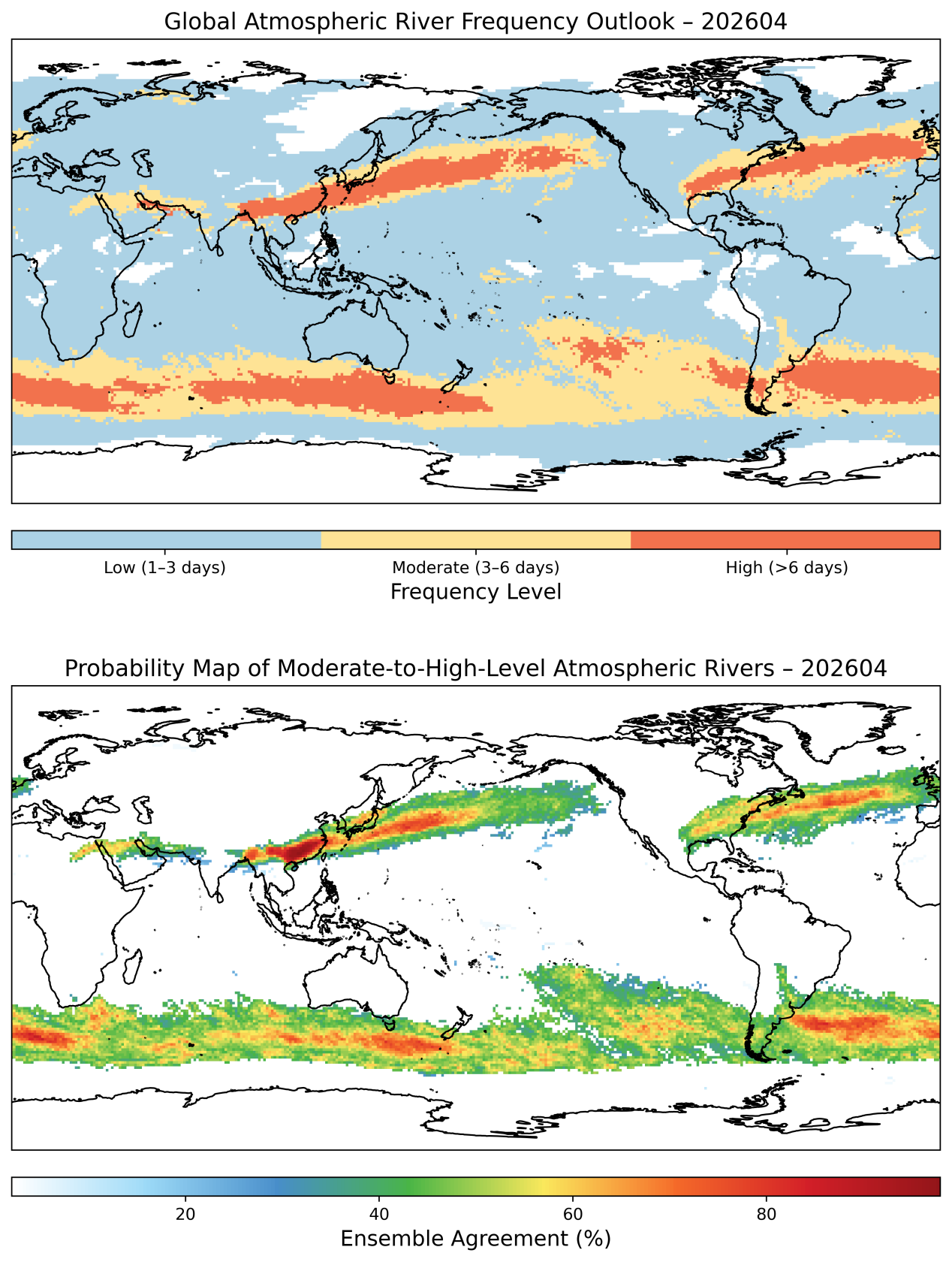 Using the PanLu2.0 Atmospheric River Identification and Tracking Algorithm developed by our team, April 2026 atmospheric river (AR) activity has been globally identified. Based on global distribution predictions, Southeast China, as well as the region spanning from the U.S. East Coast to Western Europe have a high probability of experiencing high-level atmospheric rivers in April. These forecasts exhibit strong consistency across model ensembles, particularly over Southeast China. This further elucidates the moisture sources contributing to the significantly above-normal precipitation previously predicted for the Huang-Huai region and the middle and lower reaches of the Yangtze River and regions to its south.