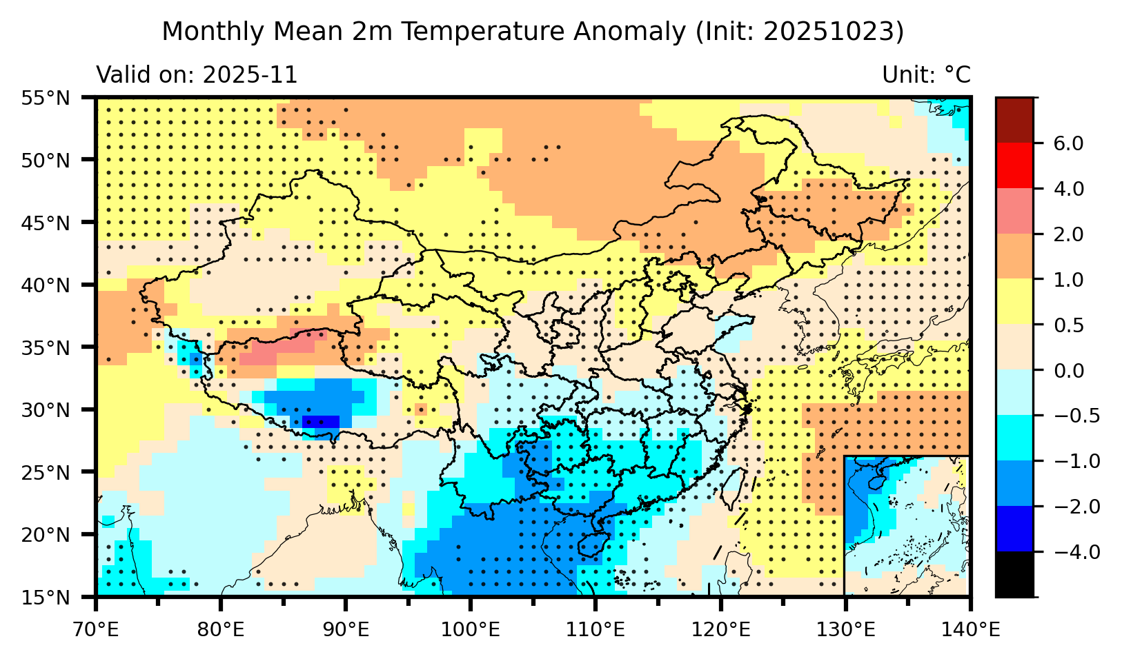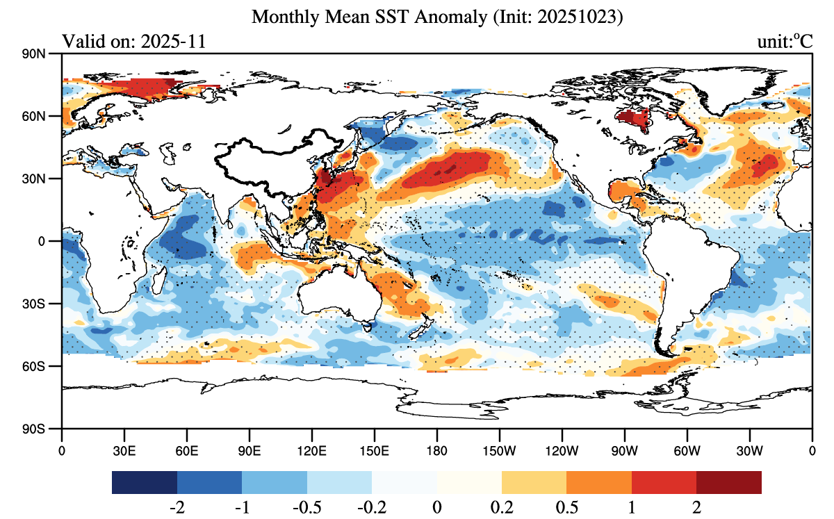 It is projected that in November 2025, near-surface air temperature across China will exhibit a “warmer in the north and cooler in the south” spatial pattern. Among southern regions, South China (Guangdong, Guangxi, and Hainan province), Yunnan, Guizhou, and the southern part of the Tibetan Plateau are expected to experience the most notable belowaverage temperatures, with anomalies reaching approximately 1 – 2 °C below the climatology. In contrast, northeastern China, eastern Inner Mongolia, and the northern Tibetan Plateau are projected to experience the most pronounced warming, exceeding +1 °C above average. On the global scale, La Niña conditions remain in place, with seasurface temperatures (SSTs) in the centraltoeastern equatorial Pacific about 0.5 – 1 °C below average, indicating a weak to moderate La Niña event. Meanwhile, a negative Indian Ocean Dipole (IOD) continues to develop, and midlatitude SSTs over the North Pacific—especially offshore of eastern China—remain warm anomalies. Under this background, coldair outbreaks are expected to continue moving southward, influencing large parts of China during November. In southern China, the interaction between cold and warm air will intensify, leading to frequent rapid temperature change, particularly over Yunnan Province. Compared with historical averages, the overall amplitude of day-to-day temperature variability across China is below average, while northeast China, Yunnan, and parts of Xinjiang may experience relatively stronger fluctuations.
