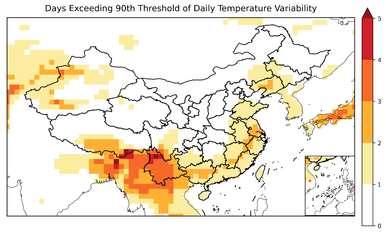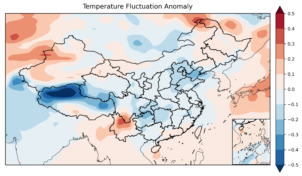 note: Day-to-day temperature variability is defined as the difference between the daily temperature anomaly and that of the preceding day. The monthly amplitude of day-to-day temperature variability is represented by the monthly mean of the absolute values of these differences.